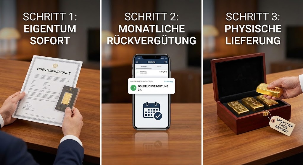 Schritt 3 – Lieferung am Ende der Laufzeit Nach Ablauf erhalten Sie Ihr physisches Gold geliefert. Was Sie bis dahin zurückerhalten haben, hat Ihren Einstiegspreis real gesenkt – dauerhaft.